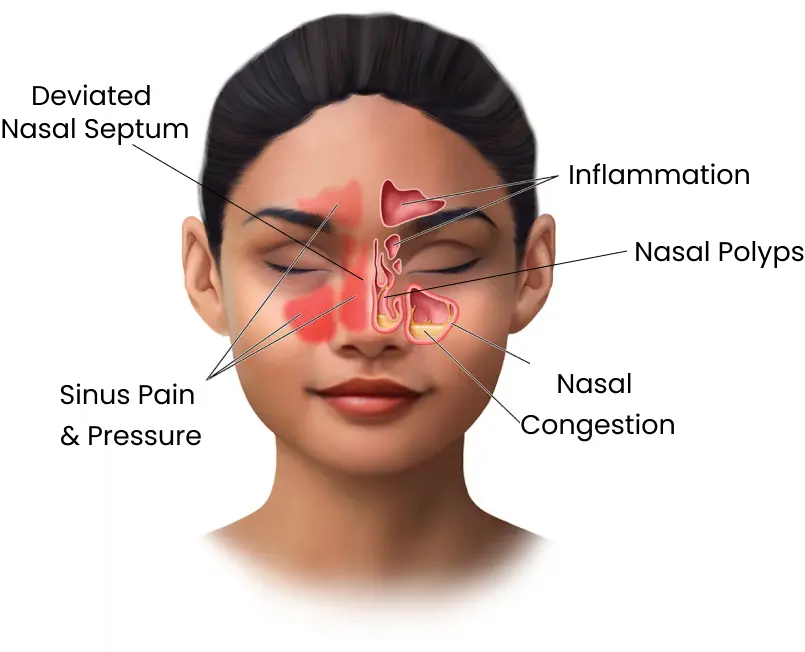 A deviated nasal septum is a displacement of the nasal wall, typically caused by injury or genetics. The symptoms include congestion, difficulty breathing, snoring, and recurrent sinus issues. If you observe these symptoms and want to avoid further complications, consult our experts now!